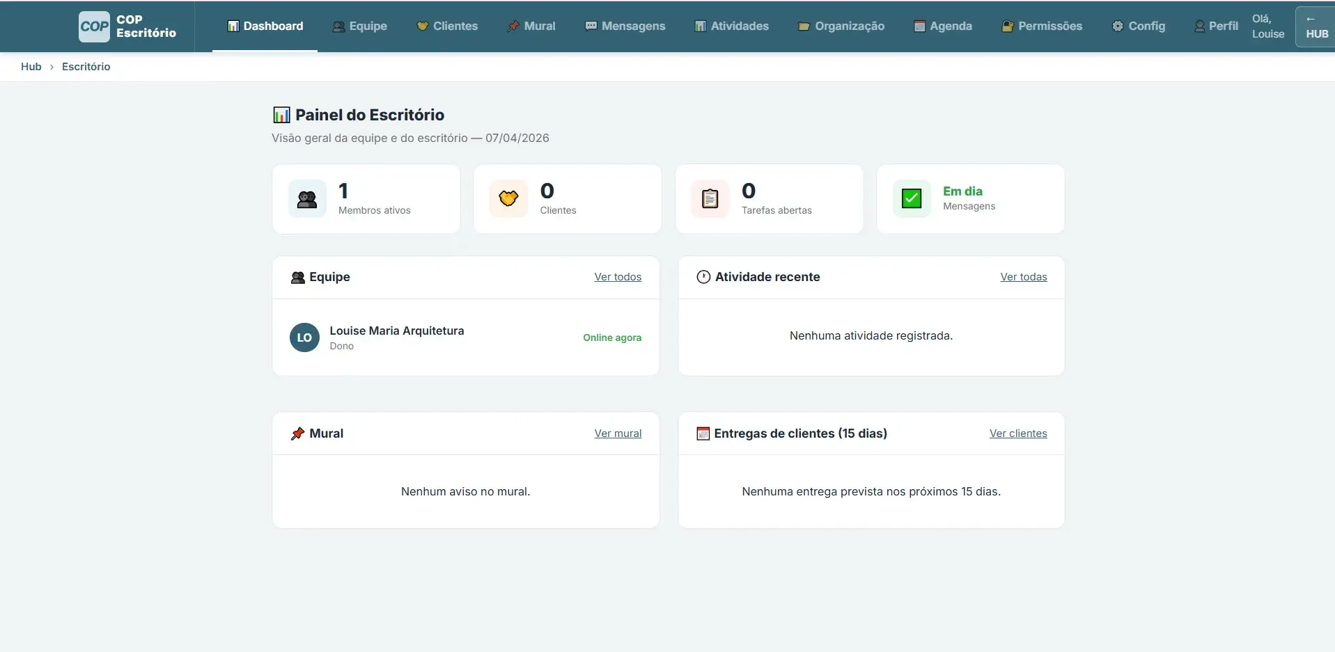 O COP é exatamente este misto de gestão, controle e rapidez: cronograma, orçamento, andamento de cada projeto, tudo registrado por cliente, na palma da mão, acessível de onde eu estiver e integrado com a minha equipe de arquitetas. Nunca mais perco uma pendência, um prazo, um detalhe importante.
